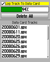 Q: Saved Tracks lose information. The GPS records a Track as you ride and this can be inspected later to re-live your ride on computer and show exactly where you've been. In times to come this could become another option to Brevet Cards and till receipts when validating AUK rides - especially Permanents. If you Save your track in the Garmin before downloading it, you'll find that useful information such as timestamps and altitude has been lost - it is now useless for validation purposes. In fact the saved tracks in the Etrex are limited to a maximum of 500 trackpoints each. In normal cycling use, 500 trackpoints represents around 30km, so if you Save any ride longer than that its going to get downsampled to fit the 500 points limit, and although the track still shows where you've been, you lose all that other vital information in the process. The way round this problem, if you have an 'x' model of GPS, that is, one with a data card, is to go into the Tracks menu and dig deeper still, through Setup to Data Card Setup, where you'll find a tickbox to Log Track To Data Card. With this, the GPS simply automatically records a 'track per day' onto the card, and these daily logs are not limited in any way - all the information is there. As you can see from the screenshot, the date of each file is embedded in its name. Out of the box, this logging option is not ticked, so you need to go in and enable it. (Note that on this page, Delete All will NOT delete your maps - only your tracks. Phew!)
