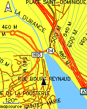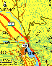 These pictures show a pinch-point on the Route Napoleon, in the Alps. Again the map is Mapsource Metroguide v9, with overlaid contours this time obtained from GPSMaps.de.