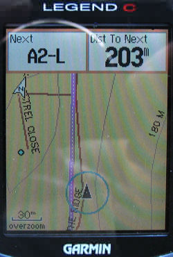 A map zoom of 80m (see top) is pretty good for navigating a dense network of roads, such as suburbia as shown here, on a pedal cycle. You get good road name information, along with a bit of a feel for the road layout. However you can zoom a bit further in for tricky junctions, or a lot further out to get a more map-like feel ... The purple line is a Route, ie a navigation line to follow, its hard to tell but in the shot above its autorouting - Follow Road in Garmin-speak. Metroguide maps out of the box do not provide autorouting with the Garmin C models - there are some ways round this, or you can pay more for the City maps which do autoroute.
