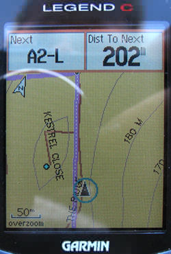 zoom 200m : track up : route off road![]() | The process continues but by now we are at zoom levels which work fine on more open country, but are not really the best for the sort of navigation you see here. Fortunately, stepping up and down the zoom levels is pretty easy while riding - even on these Etrex units where the two zoom buttons are on the side of the unit. That positioning is perfect for walkers but not ideal for cyclists - the Geko (non-mapping) and the 60 series (slightly larger than the Etrex) both have the zoom buttons more handily placed on the front panel. Road names have gone altogether on the 300m view (right) - this is a threshold which you can configure in the menus - up to you which zoom level you want to see road names, and which gets 'too busy' for you. Below 300m works for me. |