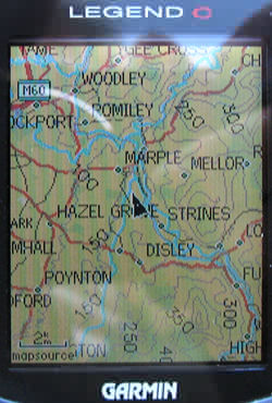 zoom 1.2km : north up![]() | Zoom 1200 is surprisingly good in remoter areas, and the zoom levels from 800 through to 2000 are all very good for giving you a sense of your surroundings during a long ride. Zoom 1200 is the widest zoom that I've regularly used while cycling. Both these screens make Marple look like rather a watery place!! |