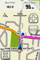 Metroguide on Dakota 20![]() | 'New' type Garmins render the same maps differently, and the scale is slightly altered too. Here is a Dakota screendump showing Metroguide in action, I'm sorry the scale, brightness and so on aren't directly comparable, but you get the idea. (NB also the Dakota has touchscreen controls overlaid.) All 'new' type Garmins render the map in this way, rather than the wireframe effect seen elsewhere on this page. There are pros and cons to each render, but in general I find Routes and Tracks display more clearly on the old style. |