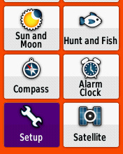 When you start up your new Etrex, it goes to the Main Menu page which looks like this (see left). Unlike the previous Etrex C models, clicking the top right button doesn't change to another page, it just sits there on this Menu page. It's now designated as a back key which gets you back to this point from any other displayed page.